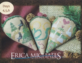 Part 2 of the 12 Berries series – contains patterns for 4 Calling Birds, 5 Golden Rings & 6 Geese a-laying. Models stitched over 2 threads on 35 Ct. Cocoa linen with Weeks Dye Works floss. Stitch count for each berry is 126×72. Design Size: 8 x 5 Finishing instructions included.