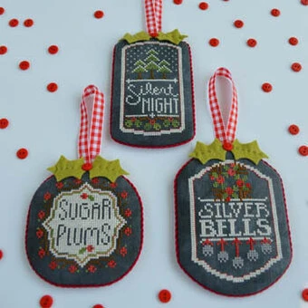 Silent Night Sugar Plums Silver Bells. Models were stitched on 32 Ct. Slate – Hand Dyed Fabrics by Stephanie (or fabric of your choice) with Gentle Art Sampler threads and DMC floss. Stitch count for each designs is 43×60. Design Size: 3 x 4 Comes with felt embellishments and buttons.