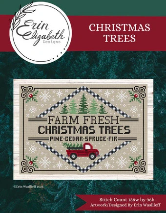 Cross stitch pattern from Erin Elizabeth featuring the phrase Farm fresh Christmas trees. Pine, Cedar, Spruce, Fir!