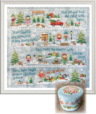 Part 4 of the 4 part Christmas Village series. Must purchase all 4 designs to complete the design as shown. Model stitched two over two on 32 Ct. Nessie Linen using Gentle Art Sampler Threads and DMC floss (or all DMC white, 945, 726, 604, 3801, 304, 704, 703, 702, 700, 747, 959, 3848, 435, 610, 844). Stitch count for this part: 54H x 223W. Design Size: 3 x 14. Full Design: 219H x 223W. Design Size: 14 x 14. Circle Design: 51H x 51W. Design Size: 3 x 3. Color Chart.