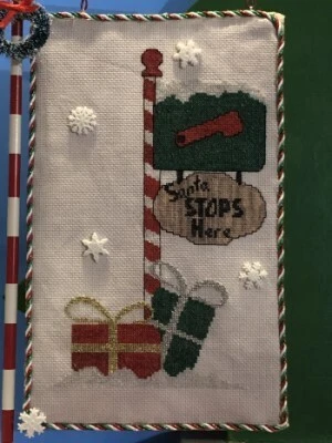 Cross stitch pattern from Barefoot Needleart featuring Christmas gifts left at a sign post!