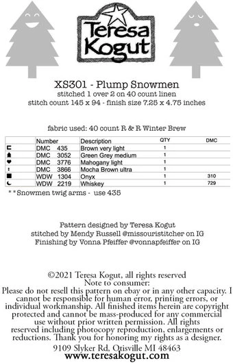Models stitched one over two threads on 40ct. R & R Winter Brew with DMC and Weeks Dye Works floss. Stitch count is 145 x 94. Finished size 7.25 x 4.75.